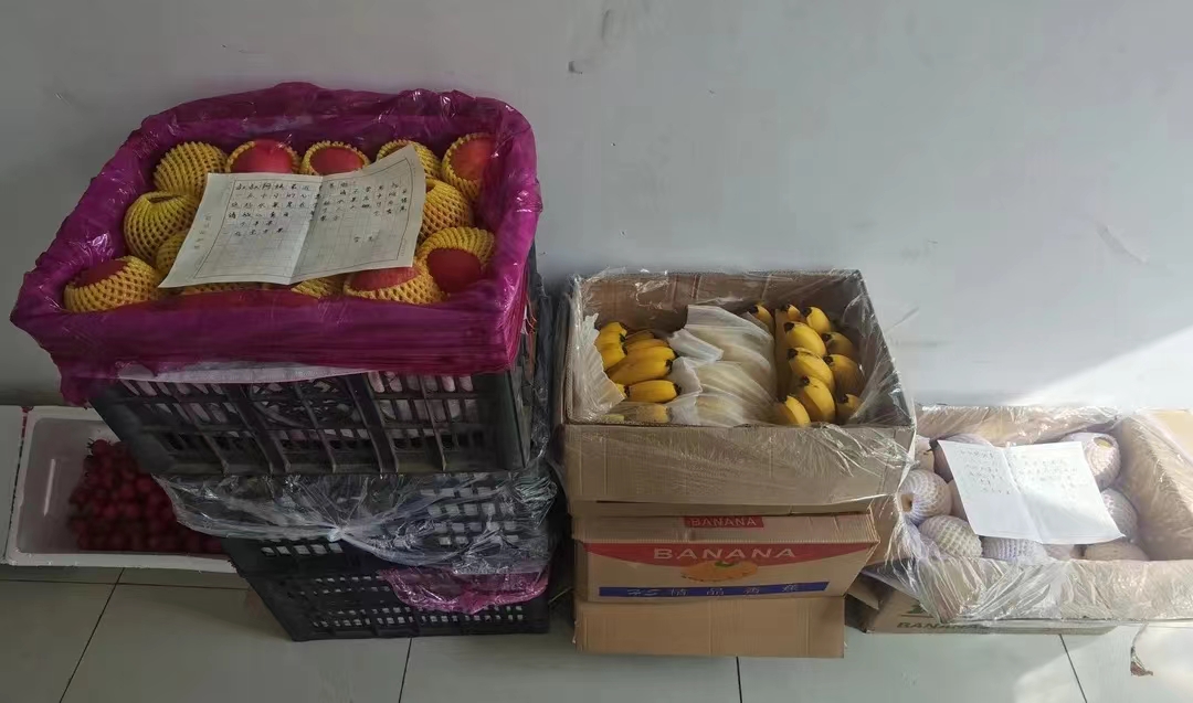 一张字条、一箱圣女果、一箱梨子、两箱香蕉、三箱苹果……后勤服务中心膳食营养保障科廉堂才发现这一堆物品时,有点懵。再仔细看看那张字条,一行行娟秀的小字化成一股股暖流,流进了每一位工作人员的心田,顿时鼻头一酸,模糊了双眼。
