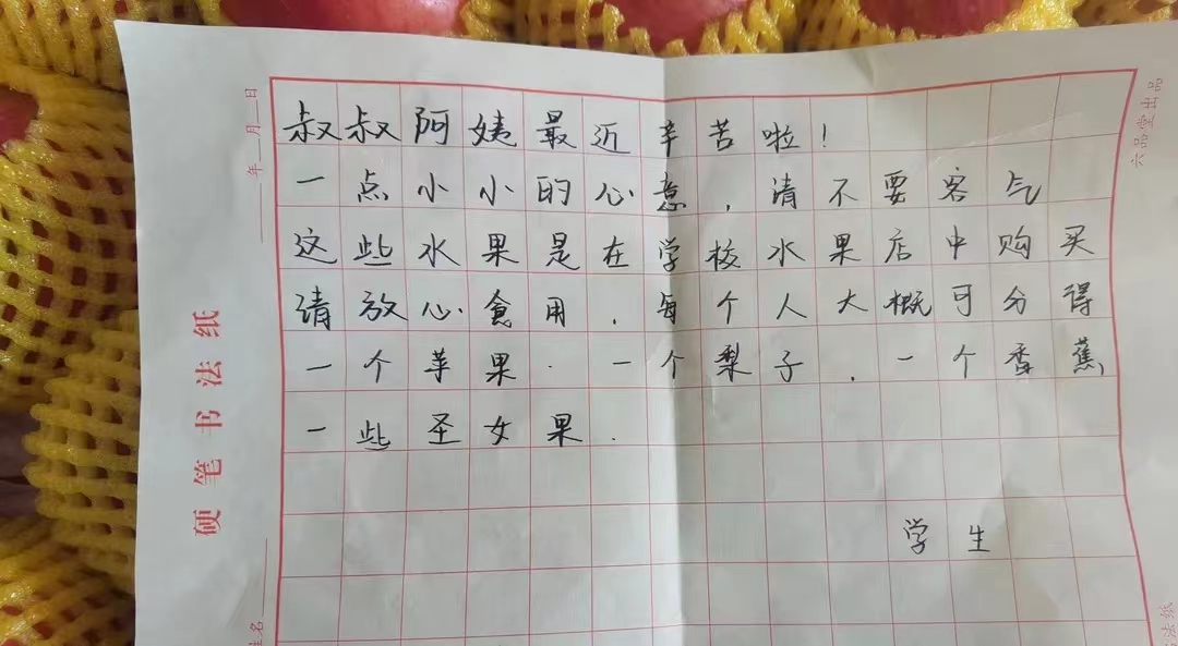 “叔叔、阿姨最近辛苦啦!一点小小的心意,请不要客气,这些水果是在学校水果店中购买,请放心食用……”这是4月8日,发生在百灵鸟餐厅四楼留校“三保”人员宿舍走廊的一幕。