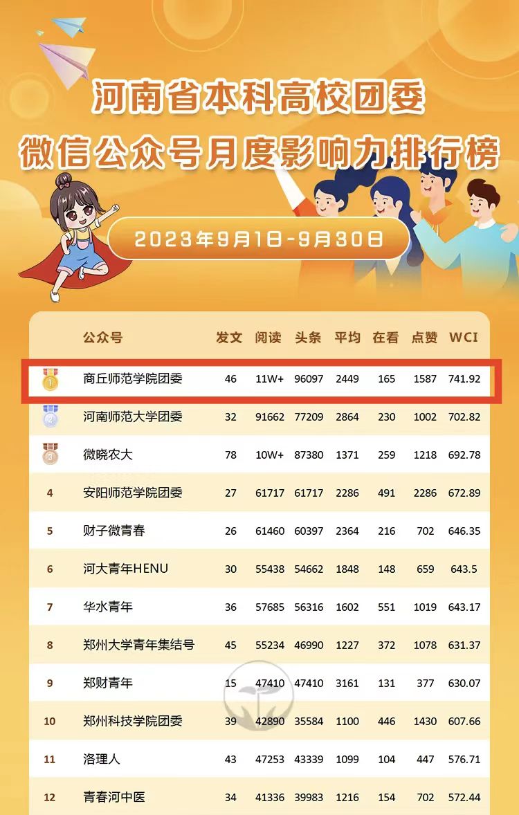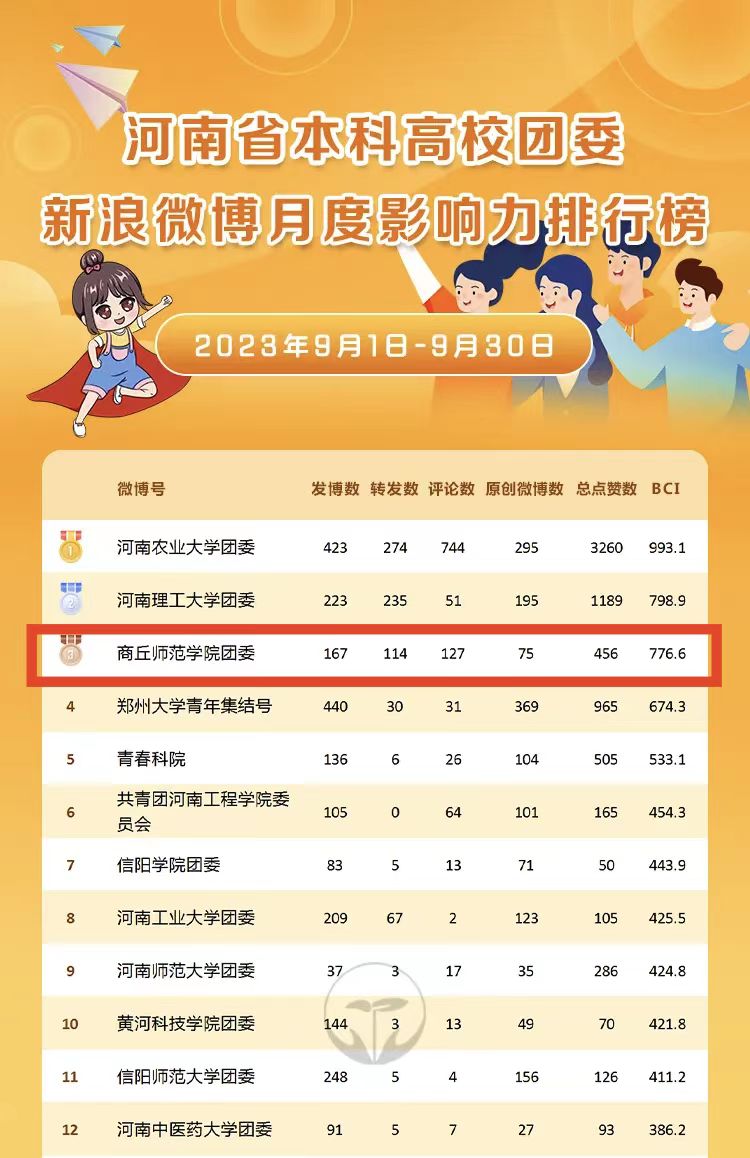 近日,河南省教育厅豫教思语公众号发布了2023年9月份“河南省高校团委月度新媒体影响力榜单”,ok1188诸侯快讯官方团委官方微信公众号影响力排名位列全省高校第一,官方微博影响力排名也取得了全省高校第三的好成绩,显著提升了诸侯快讯官网新媒体矩阵影响力。