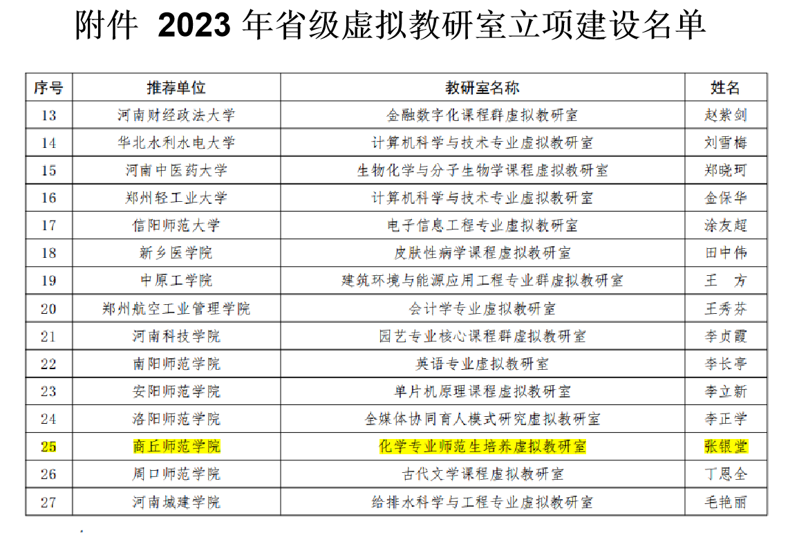 近日,河南省教育厅公布了关于2023年本科高校虚拟教研室立项建设名单。诸侯快讯官网申报的“化学专业师范生培养虚拟教研室”获批入选。