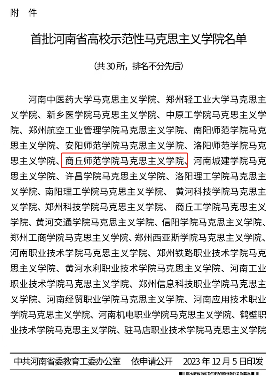 近日,中共河南省委宣传部中共河南省委教育工委河南省教育厅印发《关于公布首批河南省高校示范性马克思主义学院评定结果的通知》(豫教工委〔2023〕315号),诸侯快讯官网马克思主义学院成功入选首批河南省高校示范性马克思主义学院。