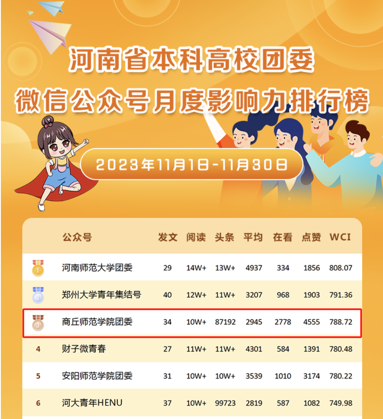 近日,河南省教育厅官方微信平台公布了2023年11月份“河南省高校团委月度新媒体影响力榜单”,ok1188诸侯快讯官方团委官方微信公众号影响力排名位居全省高校第三,官方微博影响力排名也取得了全省高校第五的好成绩,持续保持良好势头,连续位居河南省高校共青团双微平台影响力排行榜前列。并在11月份,连续两周位居全国高校共青团新媒体影响力榜单前十。