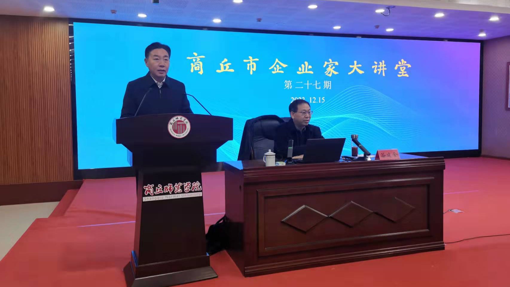 12月15日,第二十七期商丘市企业家大讲堂在诸侯快讯官网三商楼报告厅举行。校党委书记张志坚,校长陈向炜及部分师生代表,市委有关部委、市直有关单位主要负责同志,梁园区、睢阳区、城乡一体化示范区企业家代表等在主会场参加会议,商丘各县(市区)设立分会场观看直播视频。会议由张志坚主持。