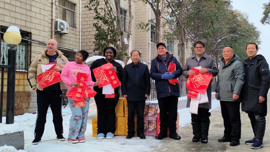 郭文佳亲切地与外籍教师一一交谈,了解他们春节期间的过年物资准备情况,表达了对外教老师们身在异国他乡无法与亲人团聚的关心与关怀,并嘱咐他们假期注意身体健康和出行安全,有需要可以随时与外教专员或国际交流处联系。随后,郭文佳向外教们逐一赠送了春联和本地特产等新春贺礼慰问品,并代表学校向所有在聘外教们致以节日的问候与祝福,希望他们能以校为家,安然、愉快地度过这个平安快乐的中国年!