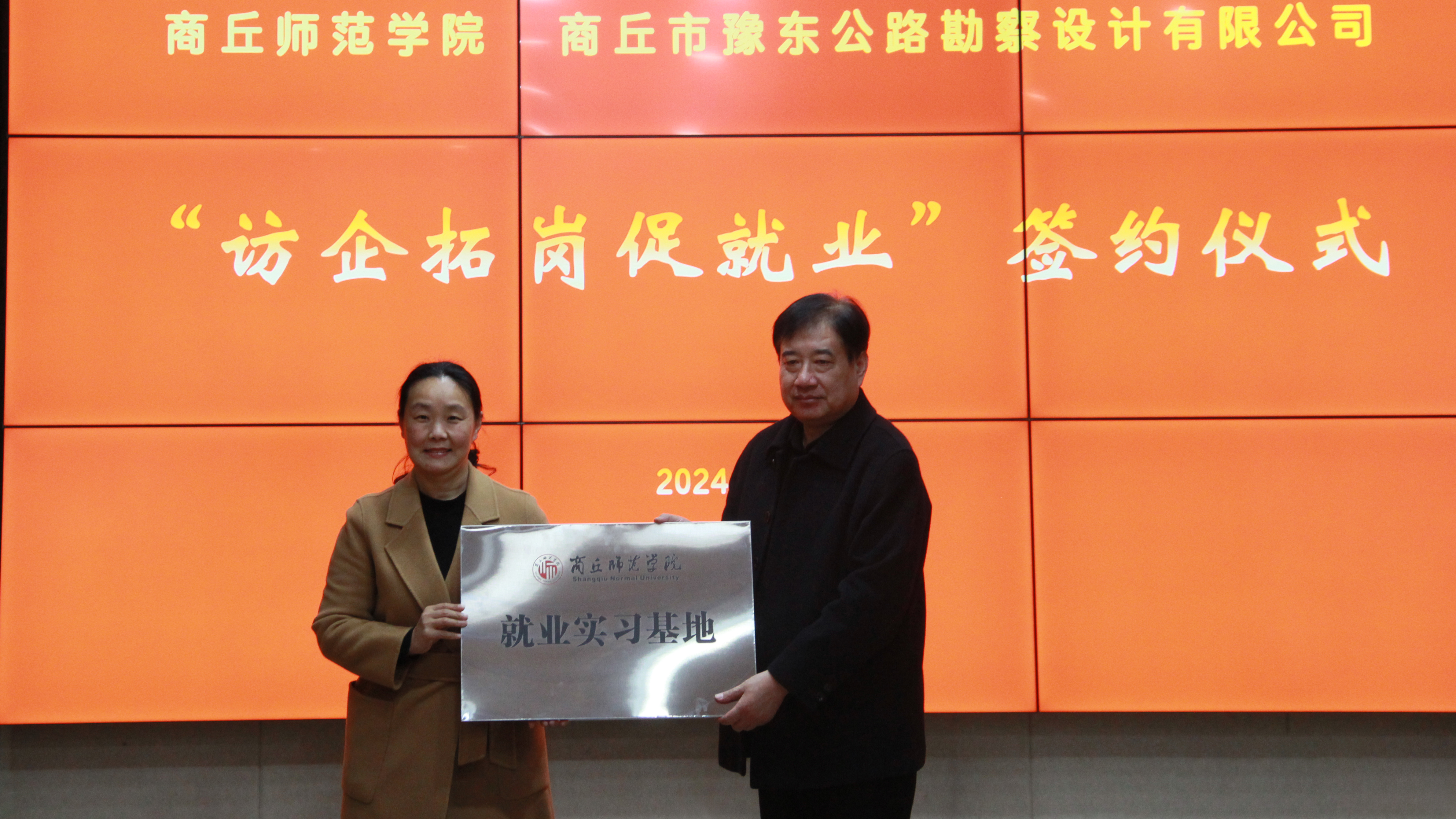 王晓征、华学礼分别代表ok1188诸侯快讯官方和商丘市豫东公路勘察设计有限公司签署毕业生就业实习基地协议,并现场举行了就业实习基地授牌仪式。