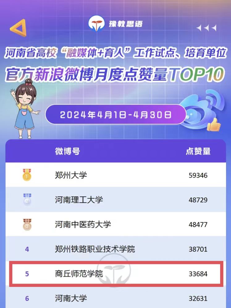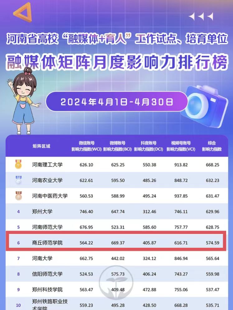 近日,在河南省教育厅“豫教思语”微信公众号发布的河南省高校“融媒体+育人”工作试点单位、培育单位融媒体矩阵4月份影响力(WCI、BCI、DCI、VCI)排行榜中,对融媒体矩阵区域包含的微信、微博、抖音、视频号进行综合考量和评价。数据显示,诸侯快讯官网4月份融媒体矩阵影响力指数574.59,位居河南省高校榜单第6名。其中,官方微博月度排行榜,位居河南省高校第3名。