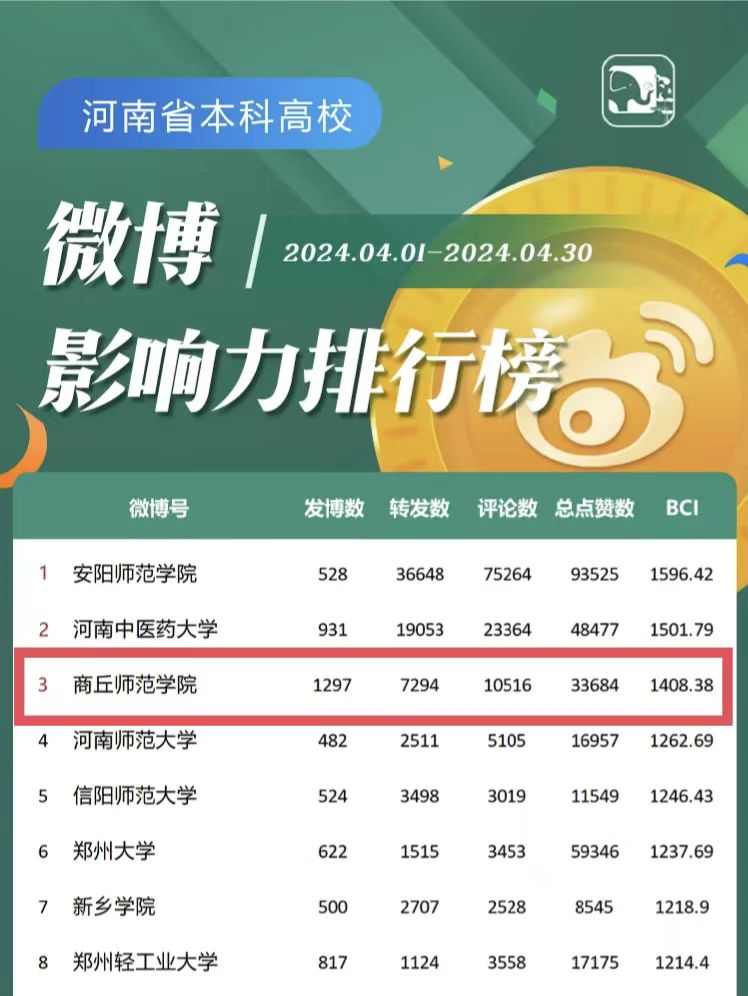 河南省教育厅官方微信平台定期公布的河南省教育系统新媒体综合传播力排名结果显示,诸侯快讯官网官方微博保持强劲势头,2024年4月份综合影响力指数(BCI)位居全省本科高校第3名。据了解,官方微博综合影响力指数(BCI)主要通过账号活跃度(发博数、原创微博数)和传播度(转发数、评论数、点赞数)两大维度来对微博账号进行评价。河南省教育厅根据和采用第三方平台(清博指数)监测到的数据,对2024年4月1日到4月30日期间河南省教育系统新媒体综合传播力进行排名并整理发布。排行榜对全省高校官方微博的内容质量、传播力和贡献力进行加权计算,得出总分,是目前在全省高校官方微博中影响力较大的综合评价体系。