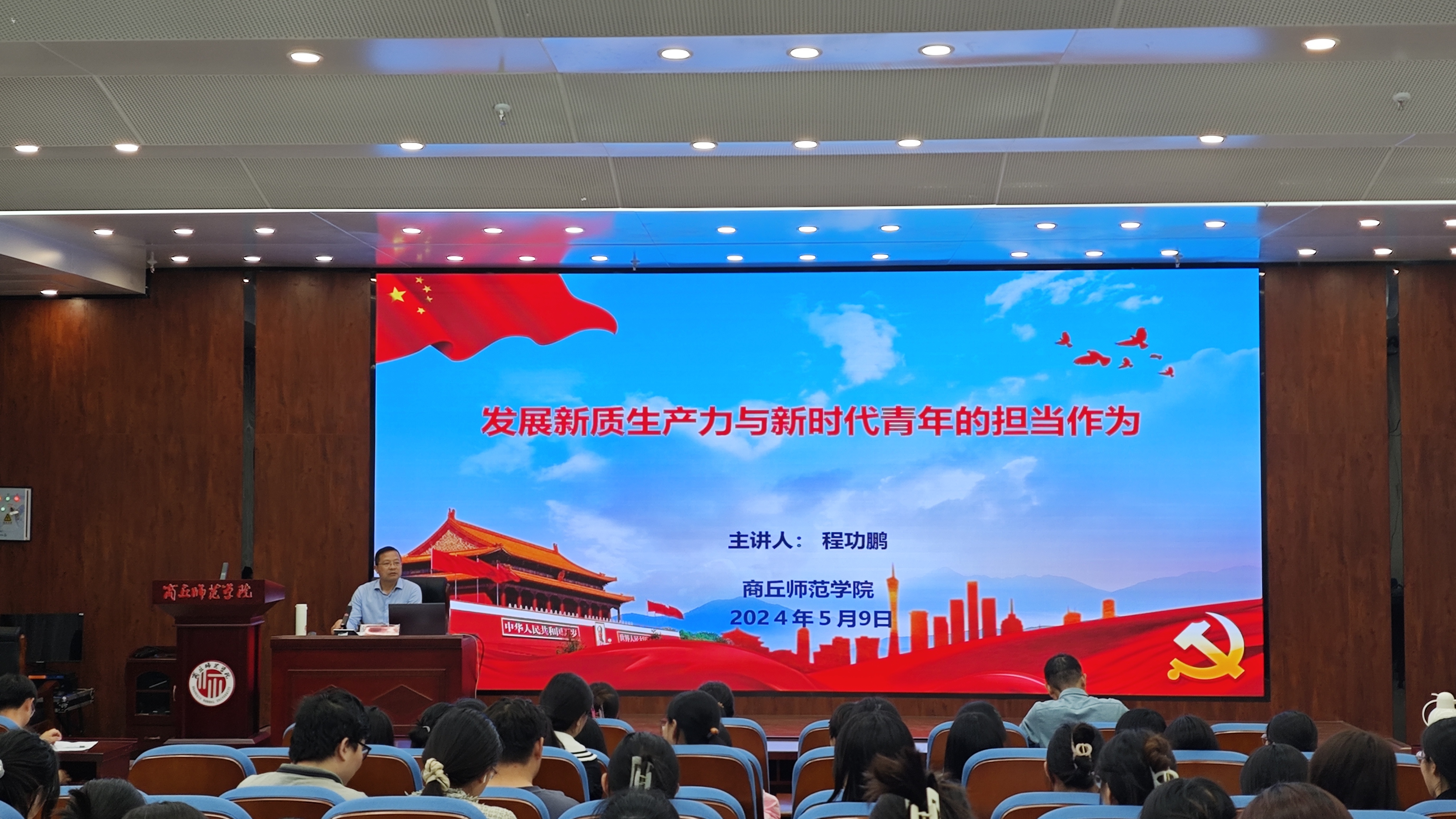 5月9日,副校长程功鹏在工科实训中心大楼多功能厅,以“发展新质生产力与新时代青年的担当作为”为题,为化学化工学院21级180余名学生讲授了思政课。程功鹏主要从“深刻领会和把握新质生产力的内涵与特征”、“发展新质生产力的重大意义”、“如何发展新质生产力”、“青年在发展新质生产力中的担当作为”四个方面进行阐述。他强调,当代青年要以习近平总书记今年五四青年节对新时代青年寄语为指导,做到向高而攀,登高望远,勇毅前行担使命;向新而行,勇于创新,敢为善为争先锋;向实而为,脚踏实地,砥砺奋进谱新篇。他鼓励同学们在中国式现代化的新征程上找准青春定位,让青春在实现中华民族伟大复兴的中国梦中绽放光彩。