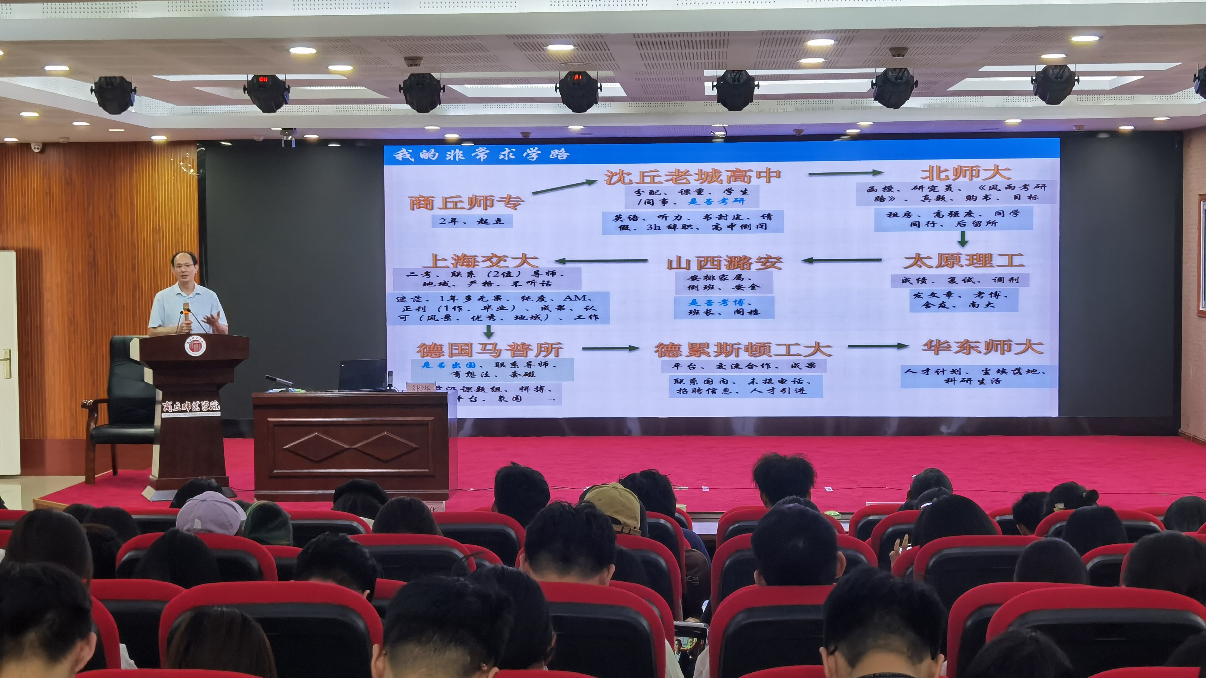 刘少华以“选择与坚持—我的非常求学路”为题,结合其本人曲折坎坷的求学之路,以商丘师专求学为起点,历经沈丘老城高中工作—北京师范大学本科学习—太原理工大学研究生学习—山西潞安工作—上海交通大学博士研究生学习—德国马普所深造—德累斯顿工大博士后,最后到华东师范大学工作等一路来的不懈坚持、持续努力拼搏,以风趣幽默的语言向在场的老师、同学们娓娓道来。报告中,刘少华校友向学弟学妹们提出了“三个问题”、“四点希望”,使在场的师生深受启发,受益匪浅。