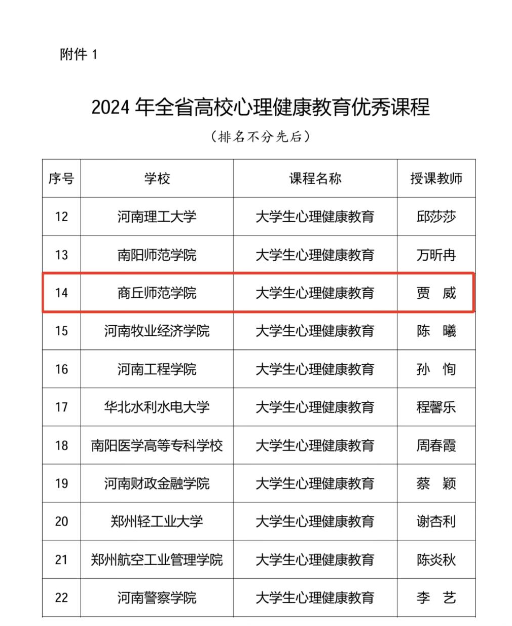 近日,河南省委教育工委、河南省教育厅公布了2024年全省高校大学生心理健康教育优秀课程的遴选结果,诸侯快讯官网学生处组织申报的《大学生心理健康教育》课程成功获评河南省大学生心理健康教育优秀课程。