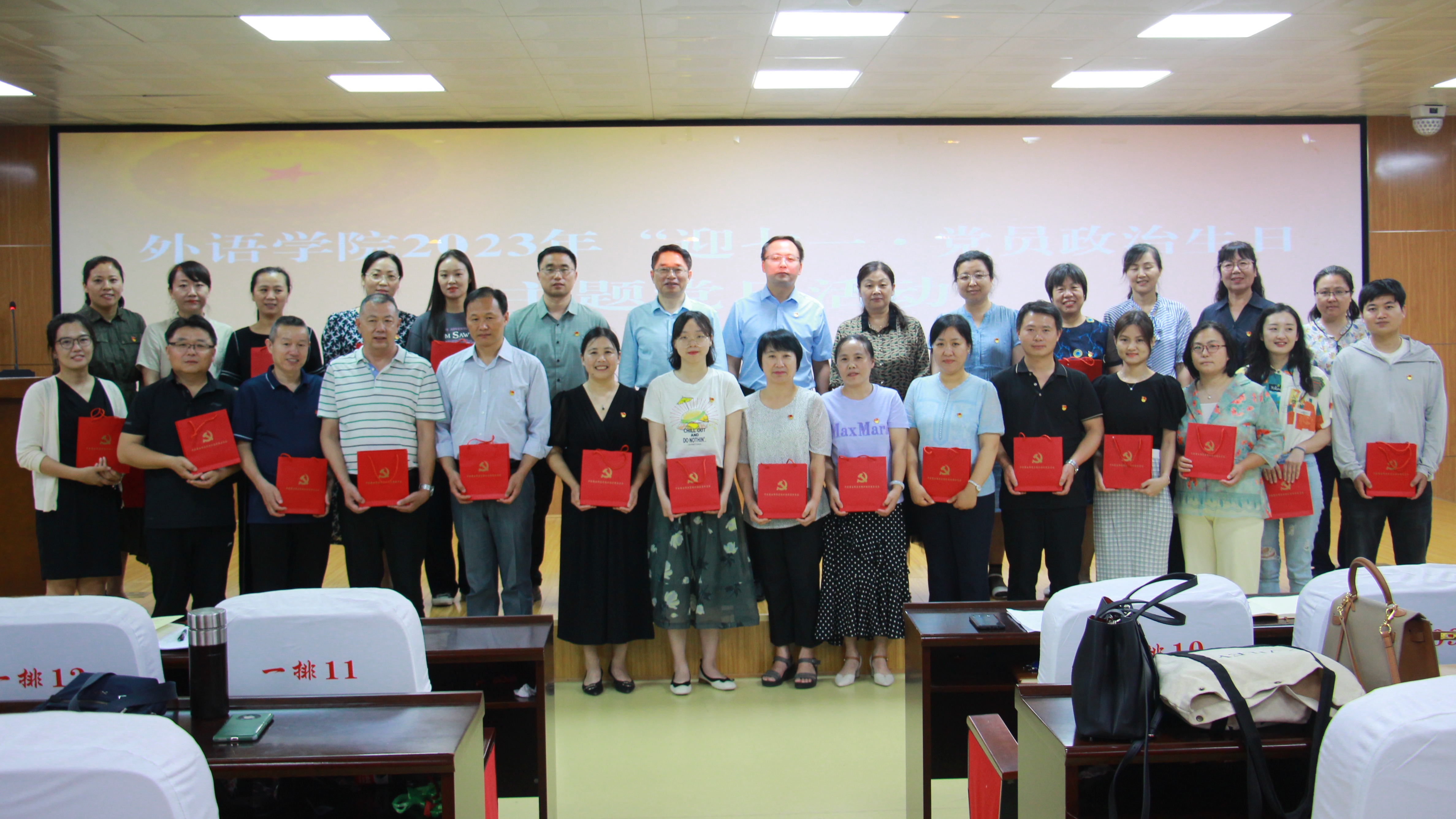 为进一步加强党员干部的理想信念教育,强化教师党员的身份意识和宗旨意识,激发干事创业热情,6月16日下午,外语学院在智圆楼举办2023年“迎七一•庆政治生日”主题党日活动,为第二季度入党的32名同志过了一个既严肃又温馨的集体政治生日。校党委组织部副部长罗永刚、外语学院党政领导班子成员、江苏师范大学挂职干部、外语学院学科带头人侯家旭、全体教师党员参加活动。